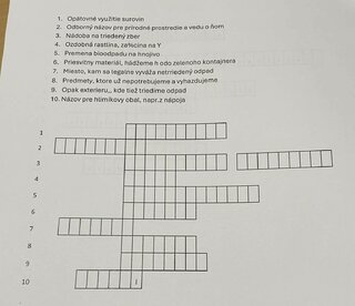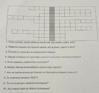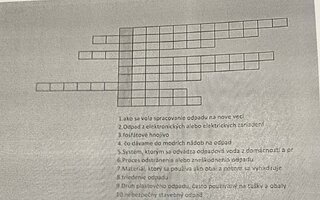 Učia sa, ako odpad minimalizovať, zhodnocovať a zneškodňovať tak, aby odpad nemal nepriaznivý účinok na životné prostredie a celkovo na ekológiu. Aby žiaci zúročili už získané vedomosti a trocha sa aj kreatívne prejavili, mali za úlohu vytvoriť tajničku zameranú na odpad, odpadové hospodárstvo, recykláciu a podobne.